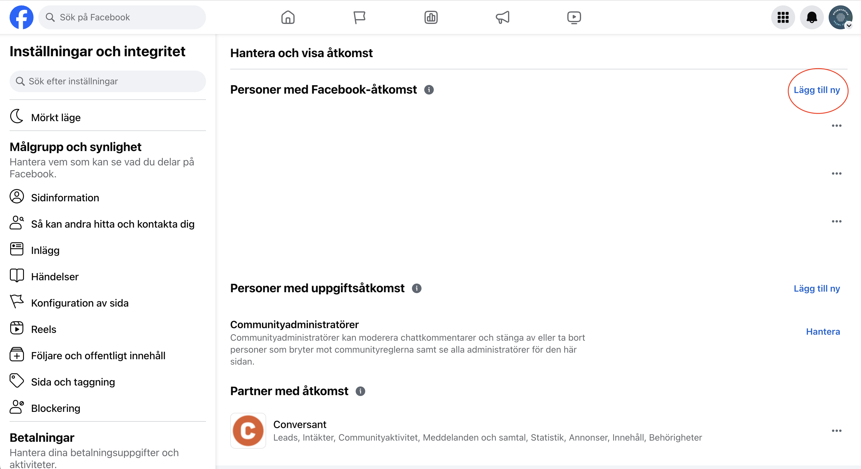 5. Bredvid Personer med Facebook-åtkomst till höger finns det en knapp som heter Lägg till ny